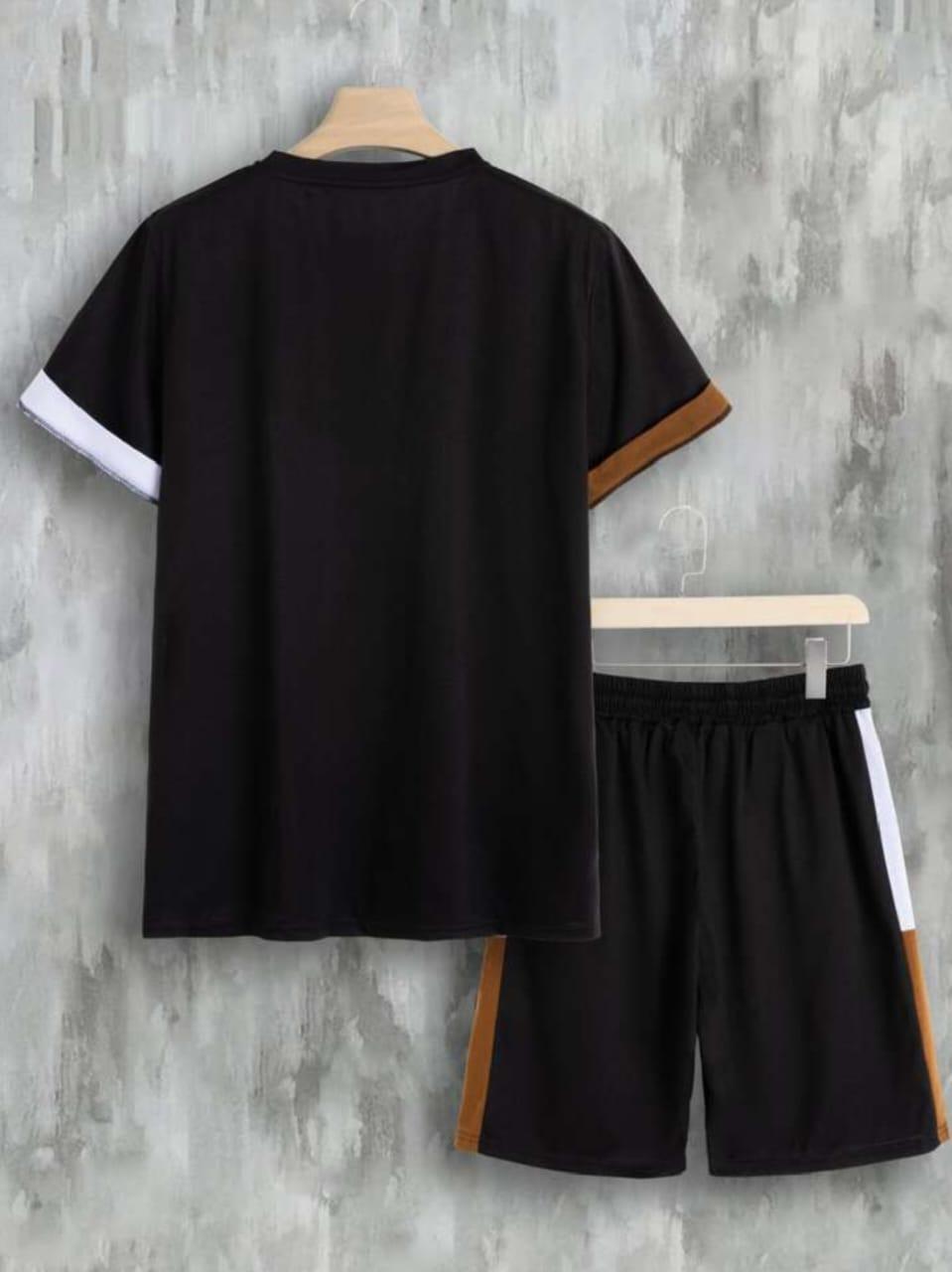 Make a bold statement with our GeoBlock Streetwear Co-Ord Set. This modern two-piece outfit features a short-sleeved t-shirt and matching shorts, both designed with striking geometric color-block panels in black, white, and brown. The angular patterns and contrast sleeves add a dynamic edge, while the shorts offer comfort with white drawstrings and side stripes..